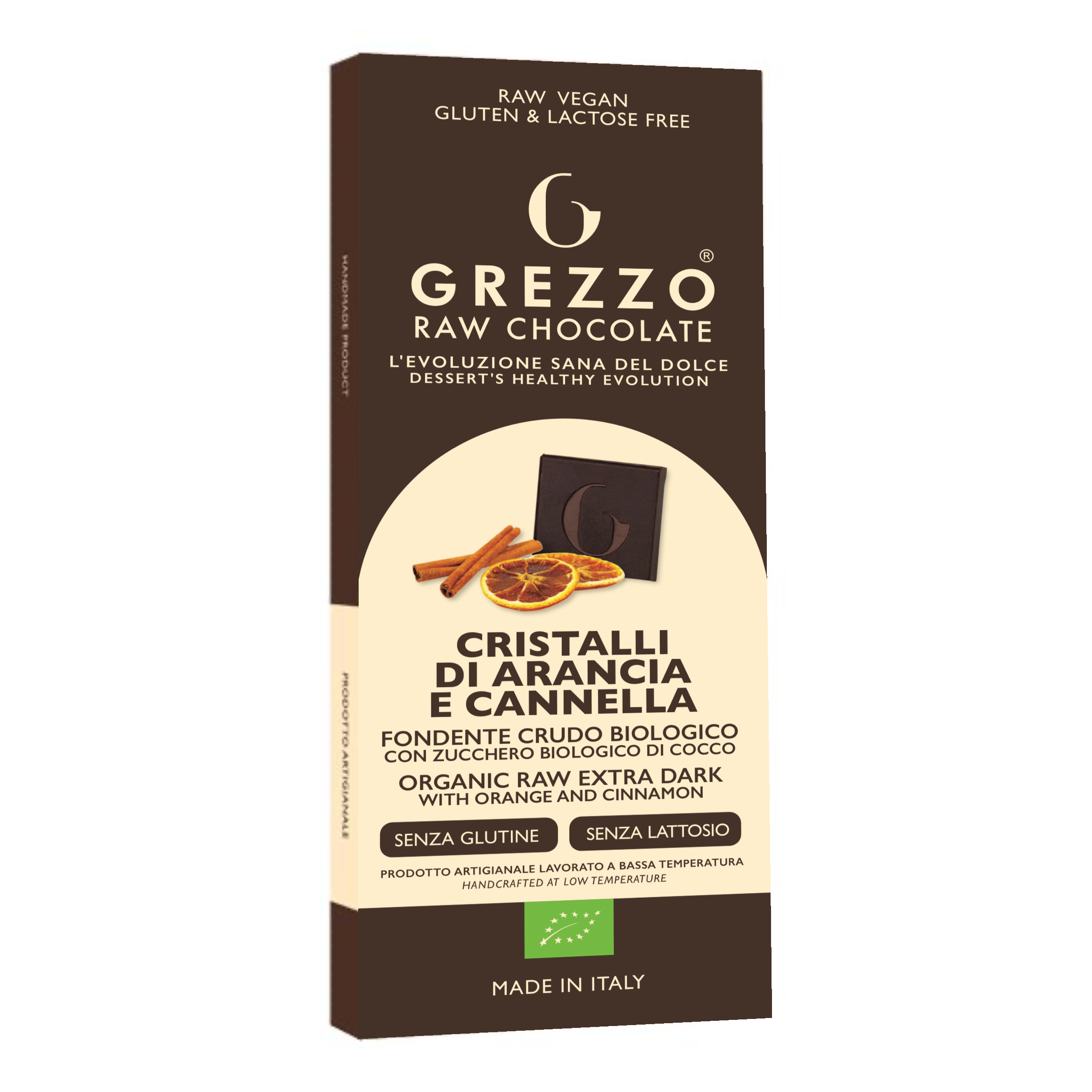 Tavoletta di fave di theobroma cacao non tostate di Fondente 80% con Cristalli di Arancia e Cannella