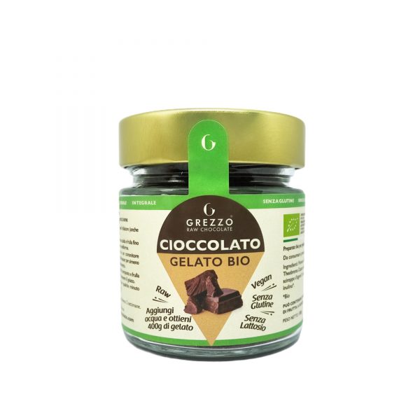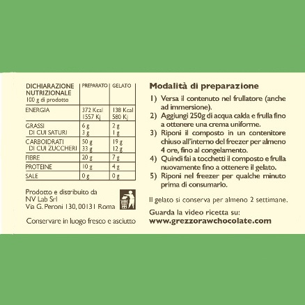 Il Preparato Bio per Gelato al Cioccolato è fatto a partire dalle pregiate fave di Theobroma Cacao non tostate utilizzate da Grezzo per ottenere un cioccolato che non ha bisogno di presentazioni. Gustoso e cremoso, il Gelato al Cioccolato ottenuto ha davvero pochissime calorie, rendendolo la prima scelta per chiunque sposi uno stile di vita sano e non voglia rinunciare alla sana bontà del cioccolato. Oltre a essere povero in grassi e particolarmente ricco in fibre, questo preparato, biologico e crudista, preserva intatte tutte le qualità organolettiche proprie delle fave di Theobroma Cacao.