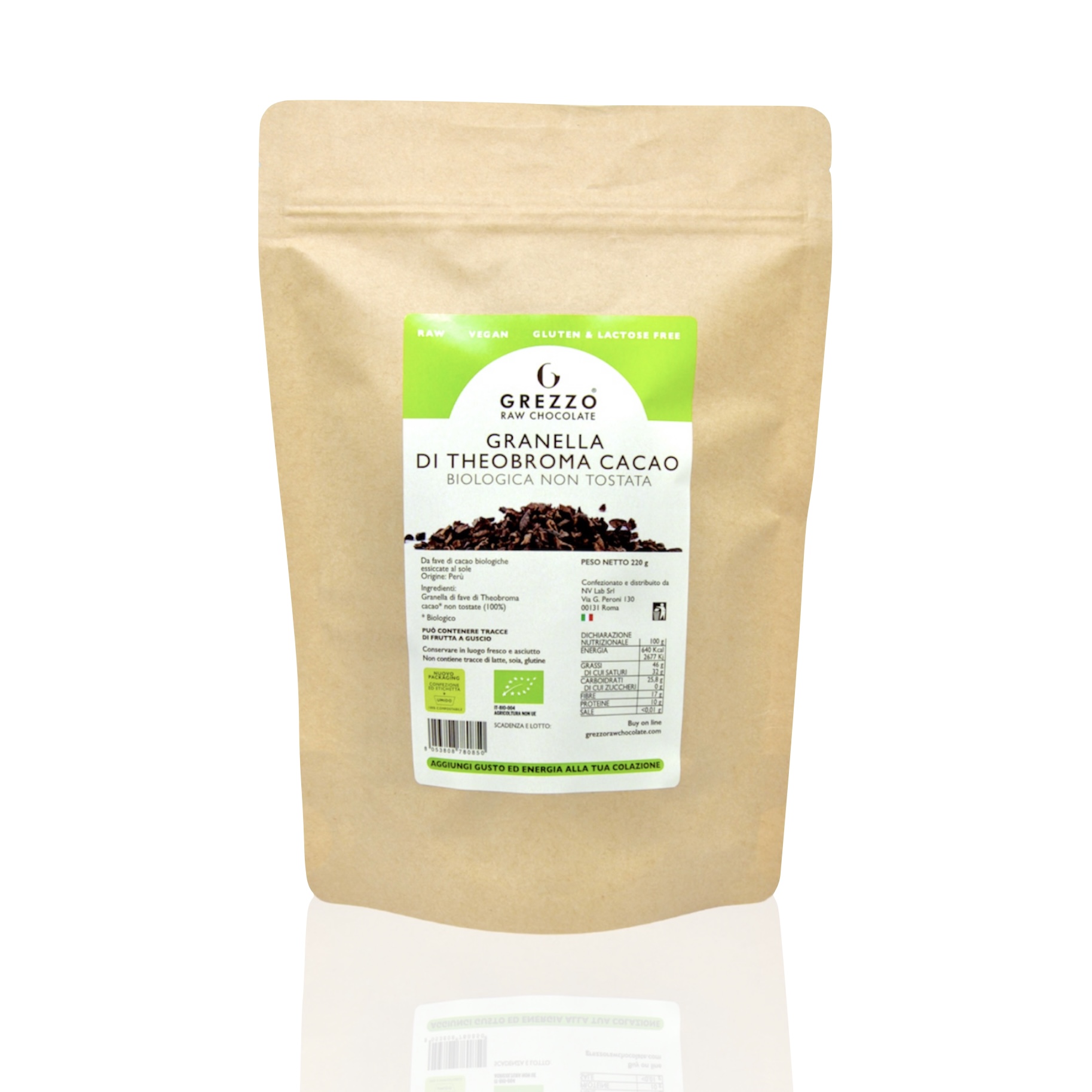 La granella di fave di cacao di Grezzo Raw Chocolate (conosciuta anche come “nibs”) proviene da piantagioni biologiche dell’Ecuador, dalla macinazione di fave di cacao essiccate naturalmente al sole.