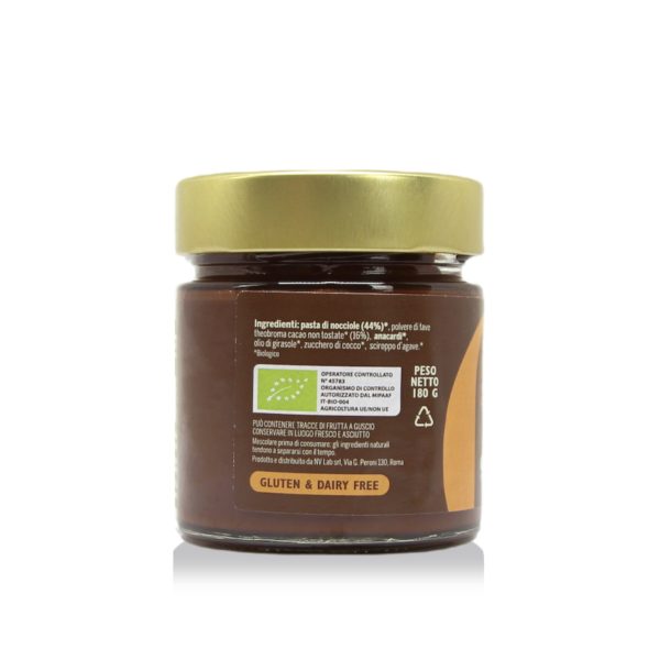 Ingredienti*: nocciole (44%), cacao crudo (16%), anacardi, olio di girasole spremuto a freddo, zucchero di cocco, sciroppo d’agave.