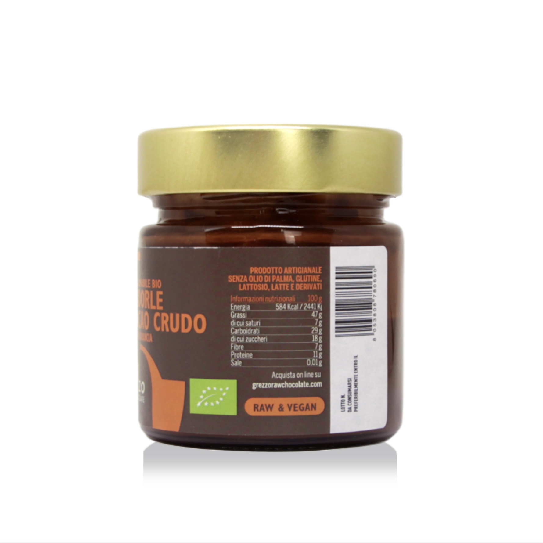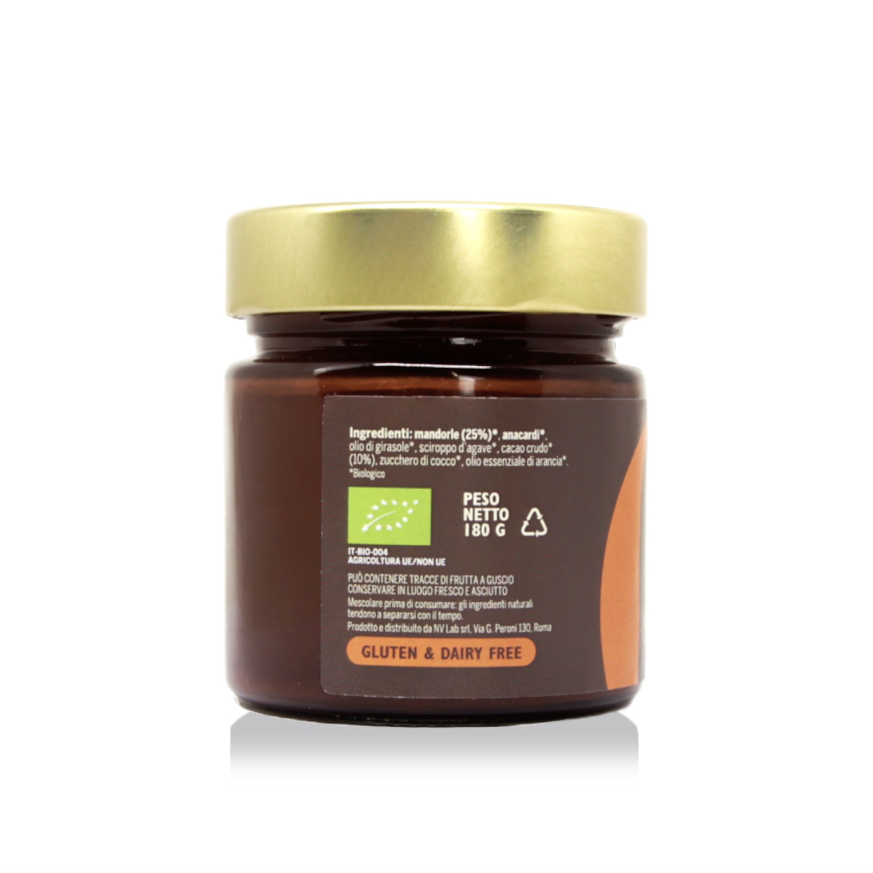 Ingredienti*: mandorle (25%), anacardi, olio di girasole spremuto a freddo, agave, cacao crudo (10%), zucchero di cocco, olio essenziale di arancia.